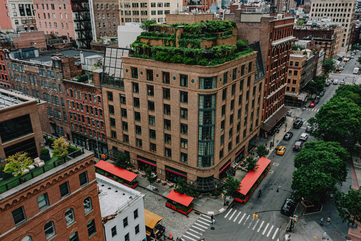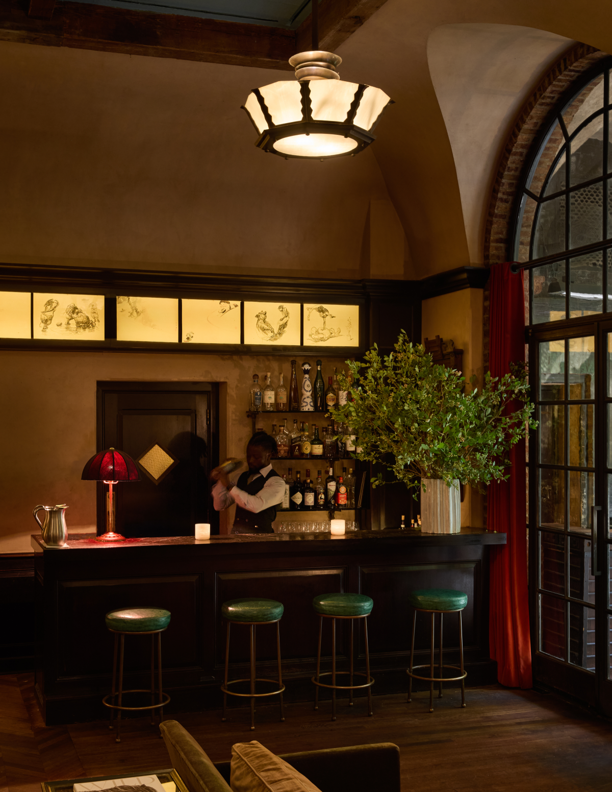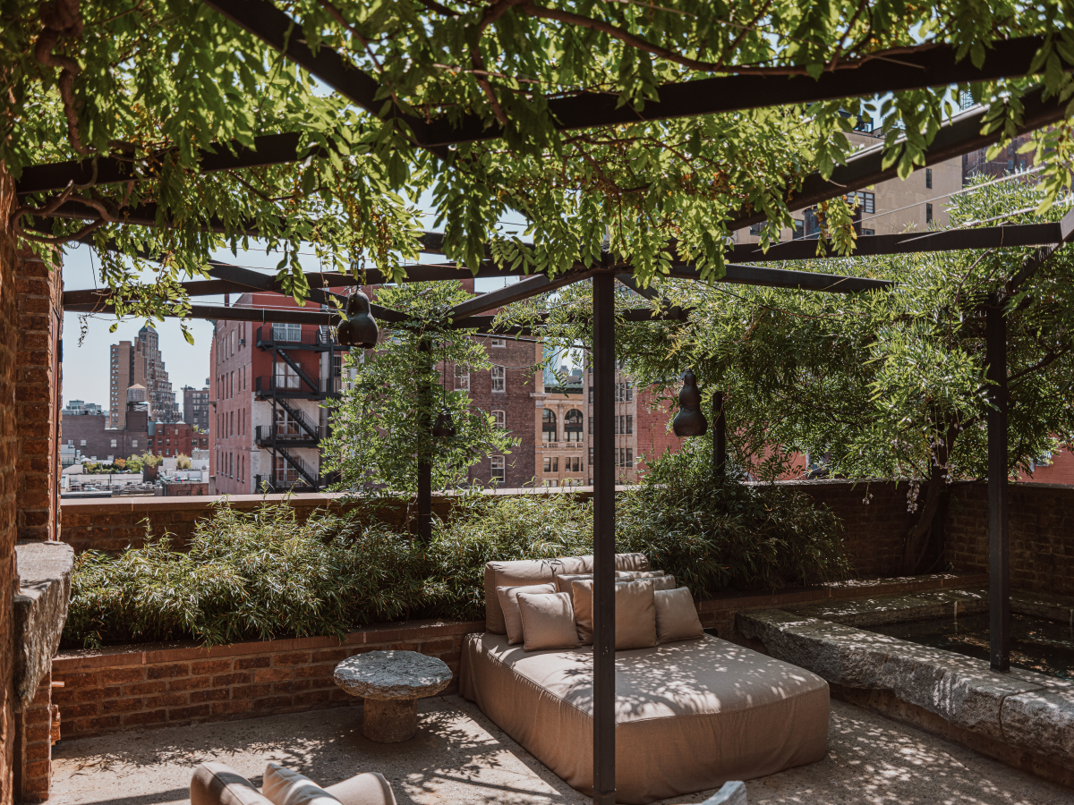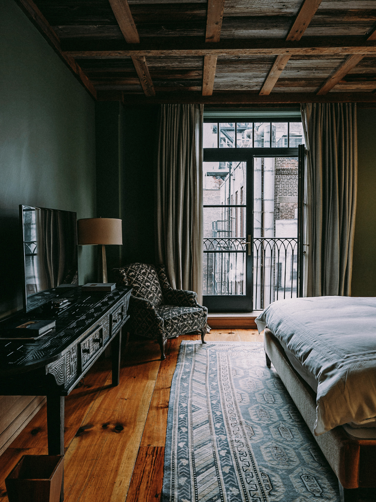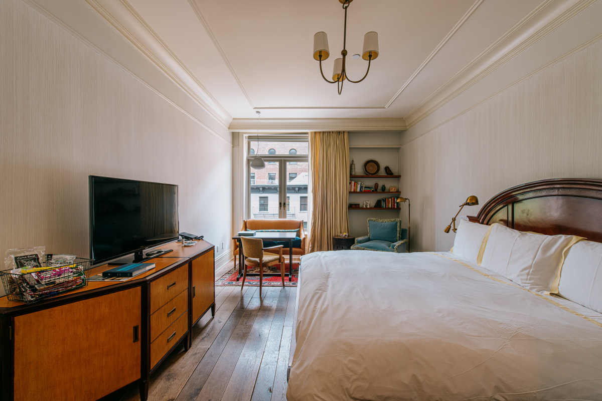 The rooms, each individually imagined, extend the hotel’s signature warmth—floor-to-ceiling windows revealing either the lush courtyard below or the quiet pulse of Tribeca streets. Tiled bathrooms gleam with sculptural marble and soaking tubs, while the minibar playfully nods to the hotel’s co-ownership by a cultural icon, stocked with nostalgic favorites and replenished generously. It’s luxury that never takes itself too seriously, creating moments of delight between the more monumental ones.